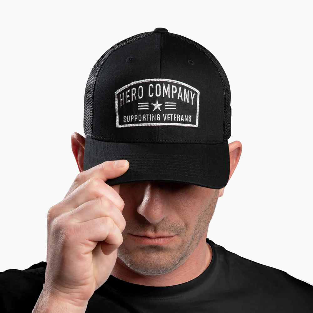 Direct and unapologetic. An embroidered patch carries the Hero Company name with SUPPORTING VETERANS set beneath it, a clear line in the sand about what matters. No need for explanation. It stands for those still carrying the weight, and for the ones who never set it down.