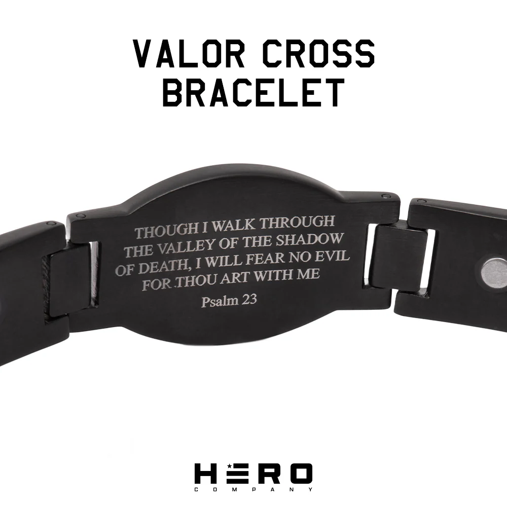 Purpose in every link.The Valor Cross Magnetic Bracelet is crafted from antique-finished stainless steel and built with quiet strength. Eight embedded magnets align with those who believe in balance, recovery, and staying mission-ready. The cross design is a constant reminder of where your courage is rooted. The verse engraved on the back draws from a battle-tested promise of protection in the face of great adversity.Each bracelet supports Veterans battling PTSD by funding the training and placement of life-saving service dogs. That’s impact worth wearing.